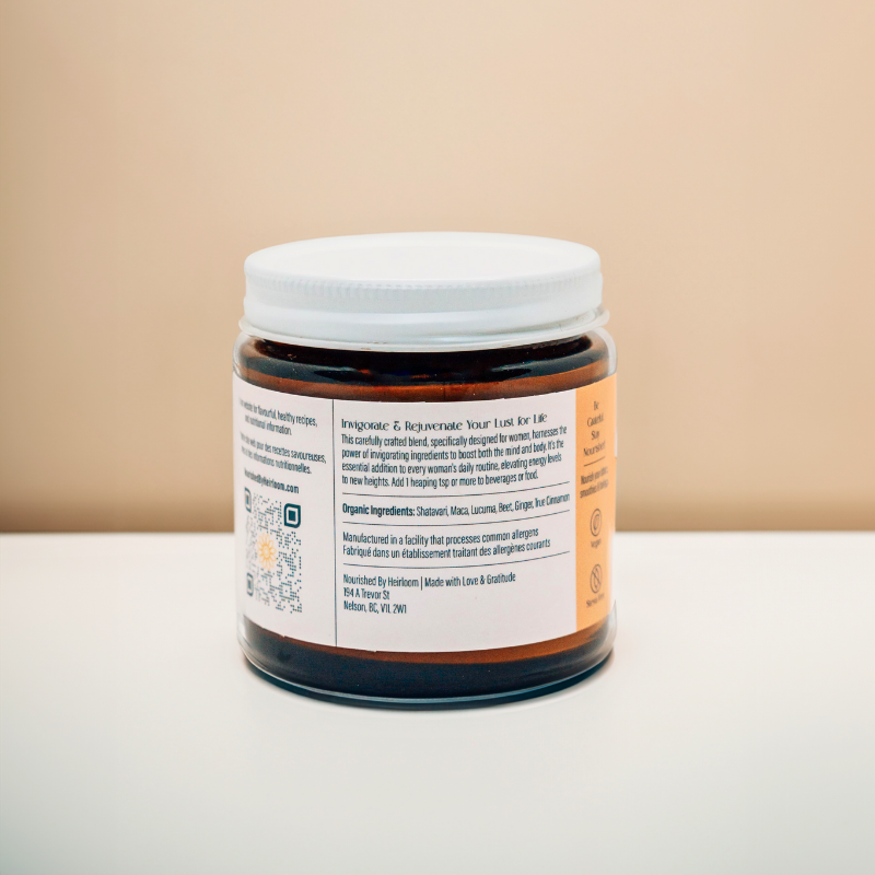 Full Ingredient List: shatavari, maca, lucuma, beet, ginger, true cinnamon