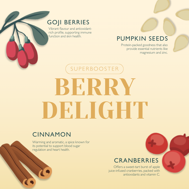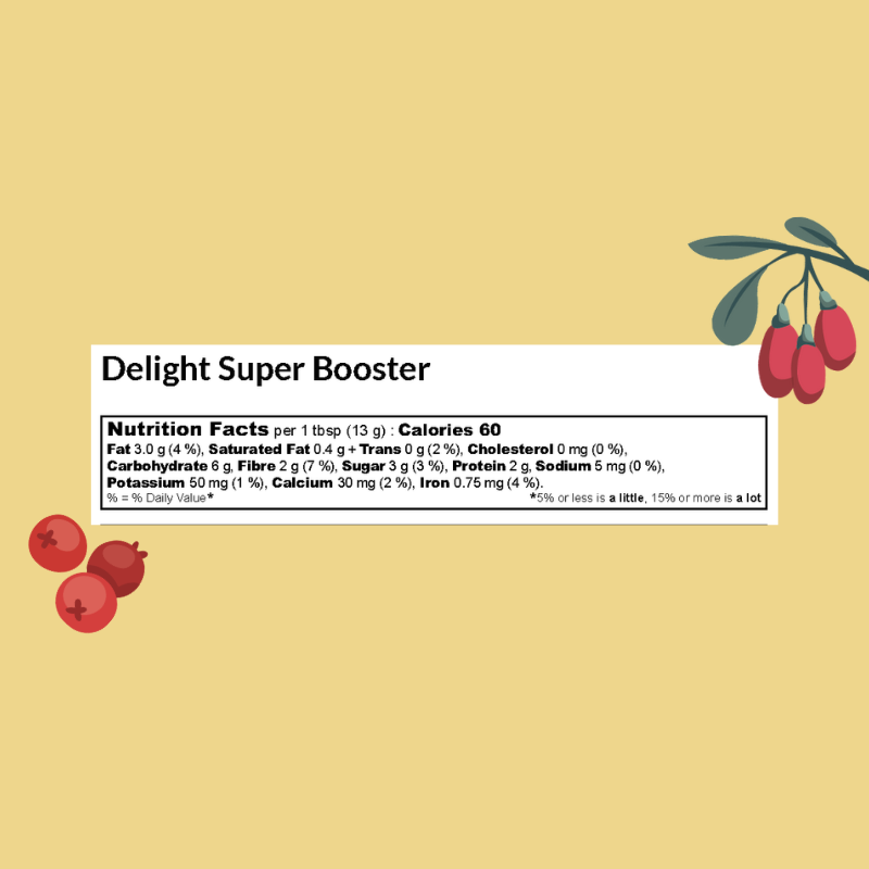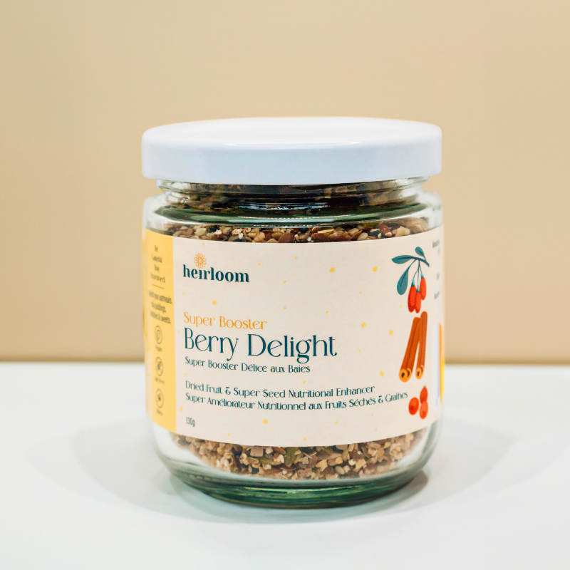 "Berry Delight" Super Booster is packed with antioxidants, fiber and Vitamin C. It makes the perfect booster for snacking, adding to oatmeal or yogurt, or incorporating into your favourite baked goods and smoothies.