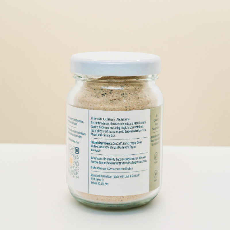Full Ingredient List: sea salt, garlic, pepper, onion, maitake mushroom, shiitake mushroom, thyme