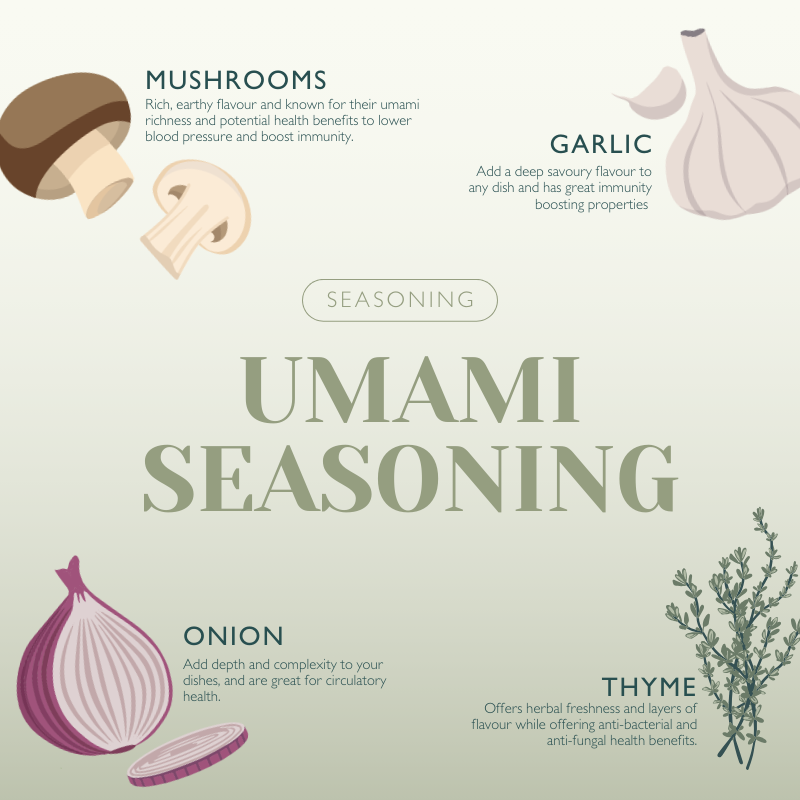 Umami is often referred to as the fifth flavour, alongside sweet, salty, sour, and bitter. It adds depth and savouriness to your dishes, making them more satisfying.The "Umami" blend is versatile, suitable for seasoning a wide range of dishes, from soups and stews to pasta and grilled meats.